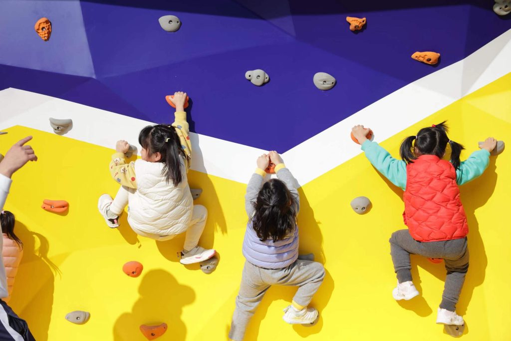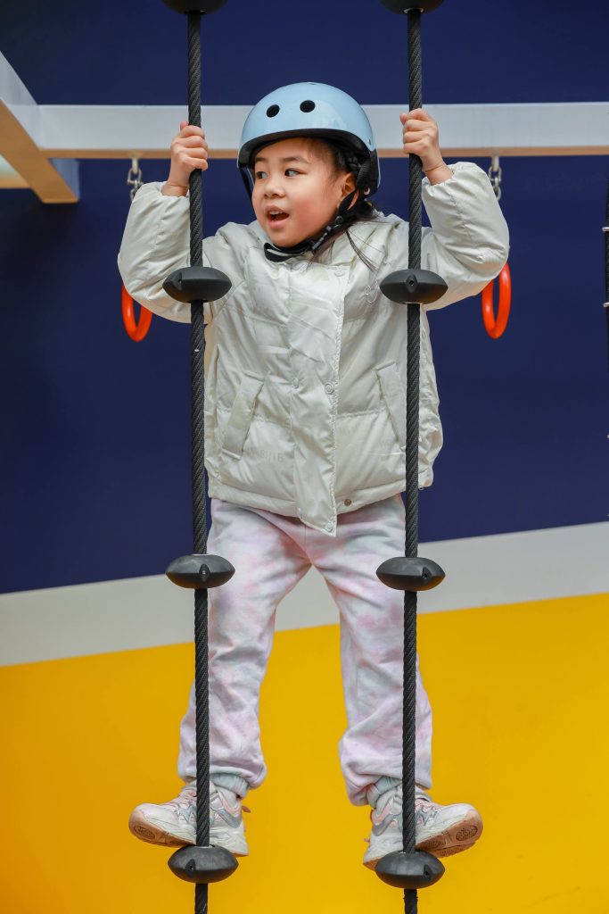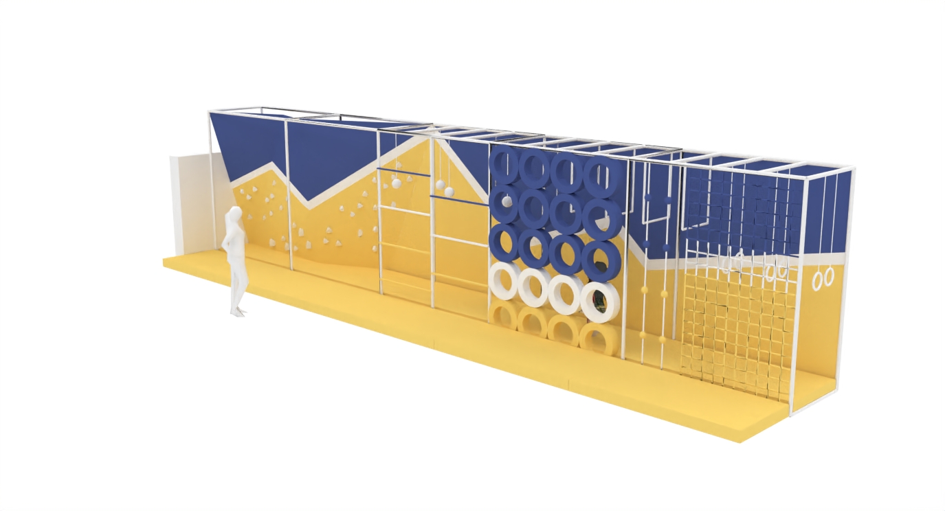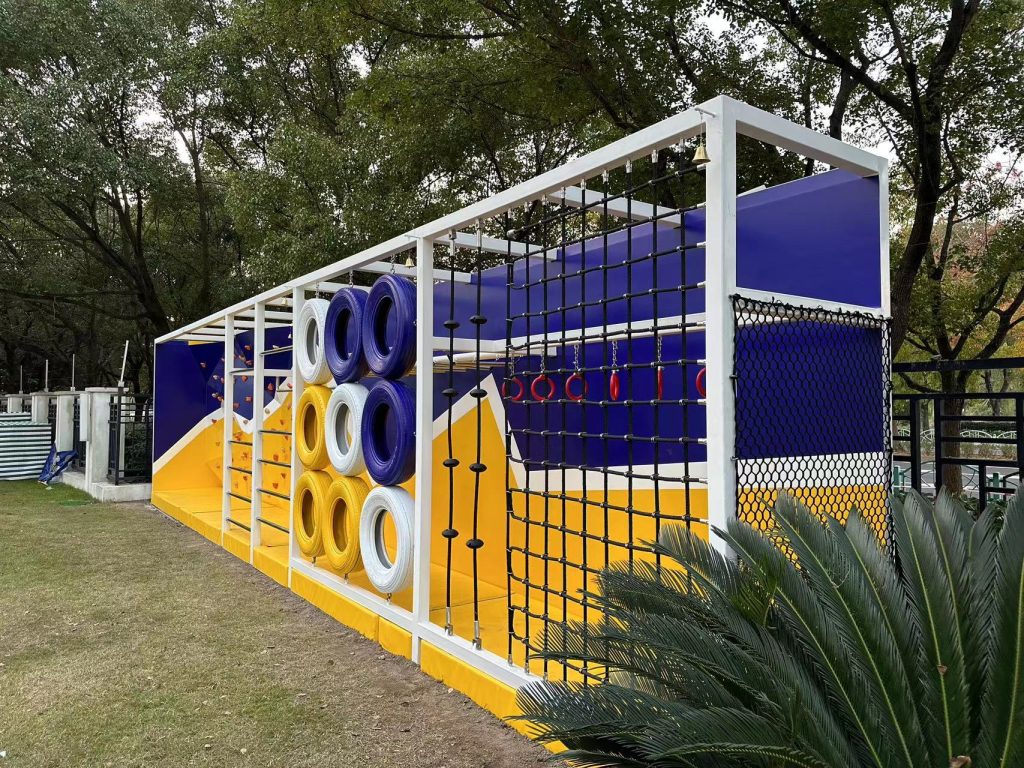 The outer facade of the box combines climbing poles, tires, and climbing nets with low difficulty coefficients, so children are less likely to fall and get injured. The interior is equipped with climbing walls, hanging rings, and hanging rods with high-difficulty coefficients. There is a safety pad at the bottom to prevent injuries from falling.
