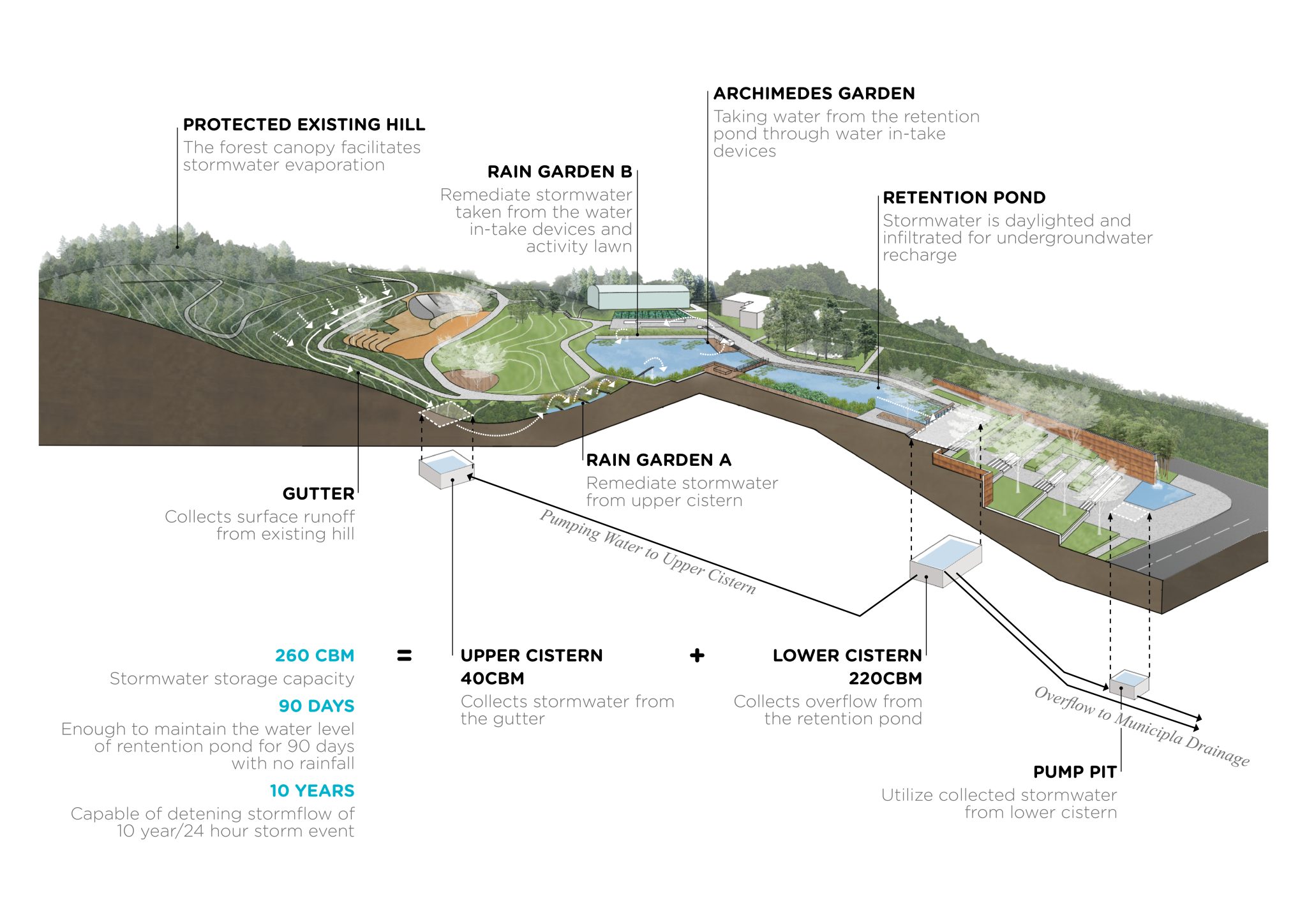 The core principle of the design is to preserve the existing ecosystem including the body of water and vegetation as much as possible. The program is designed to provide diversified activities for the residents as well as to integrate with nature. While a water management system was incorporated into the design of the park, the park has also become an educational center for sustainable uses of water resources.