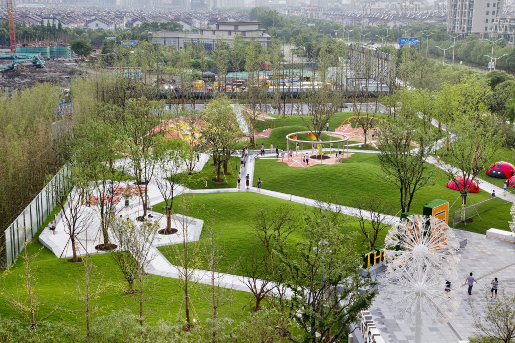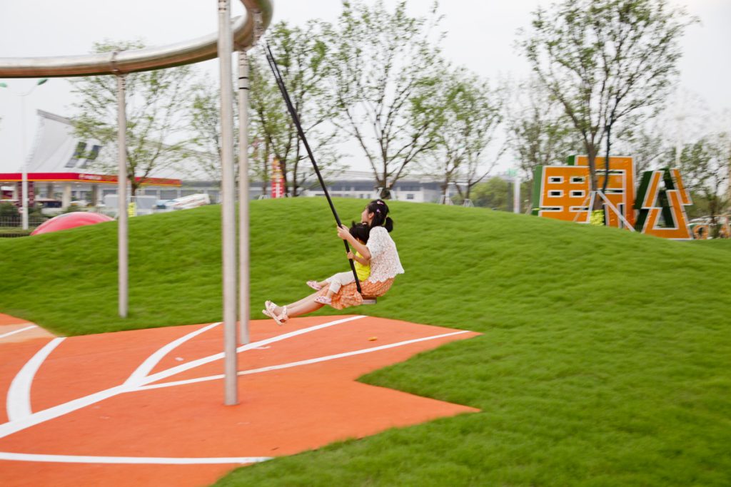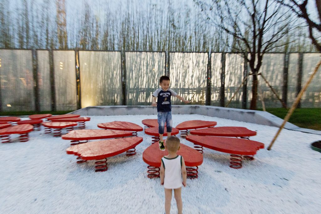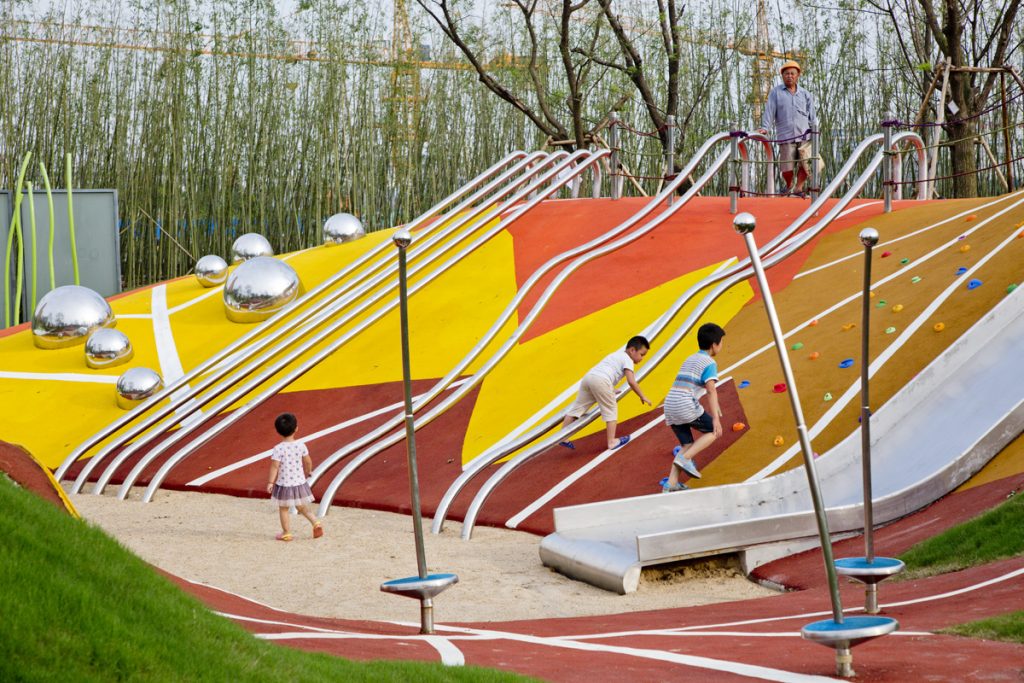The hill park has grass slopes that mimic the natural hills and white gravel as two primary low-cost materials. Several interactive sculptures designed and built by Z+T Art Studio are placed in the park to create a wonderland for children to play.