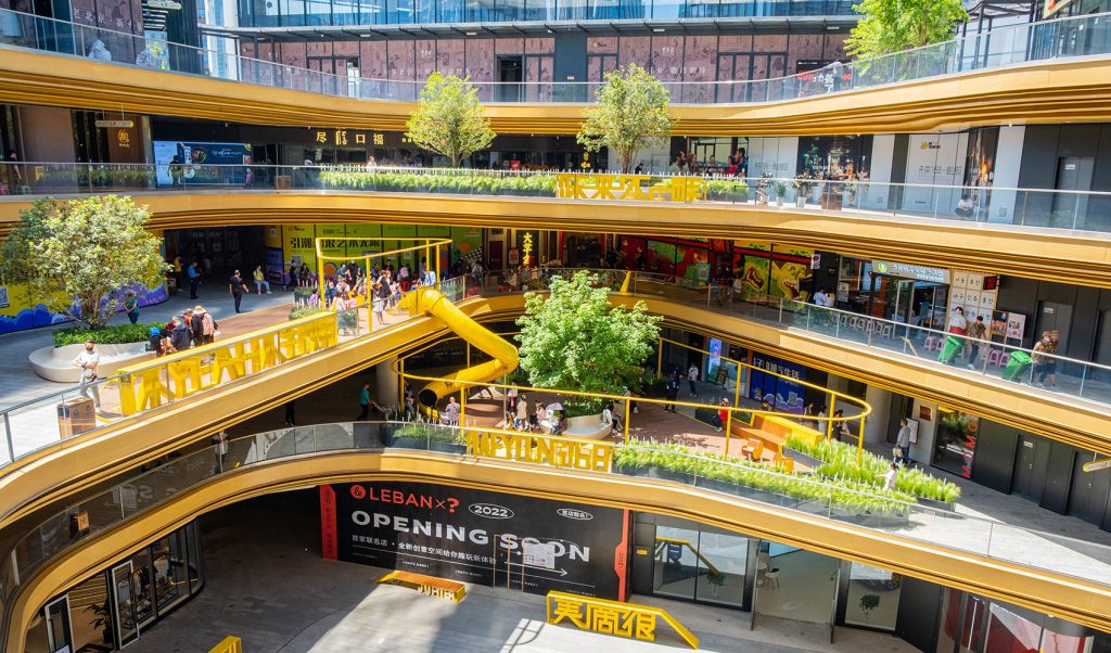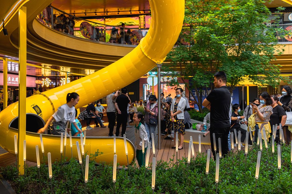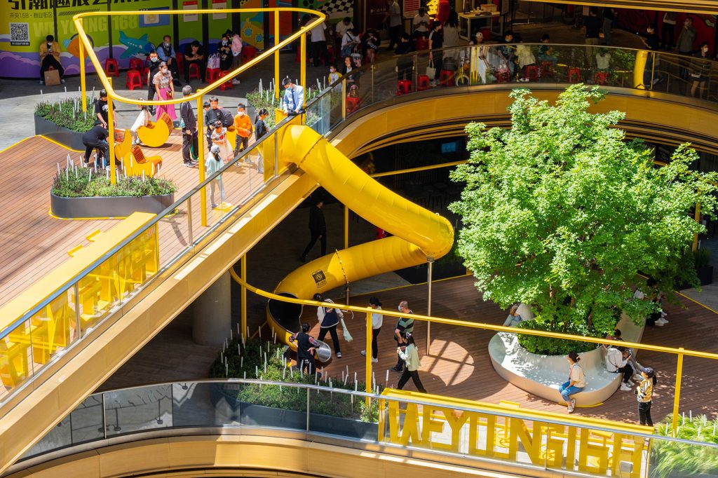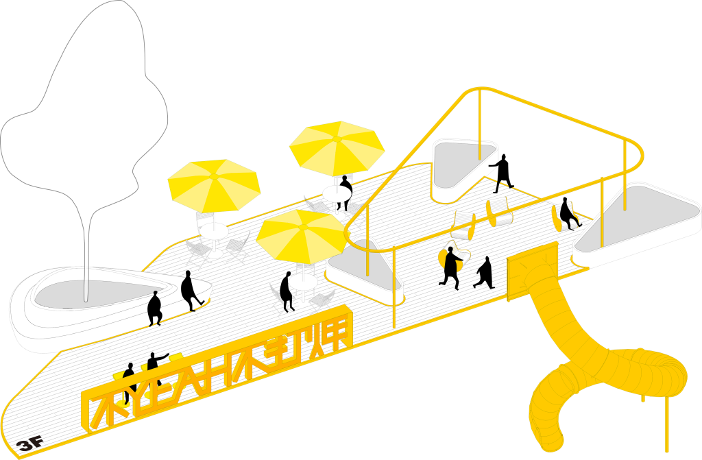 A wooden platform is placed to create a warmer and more comfortable feeling. Bar tables, flower beds, benches, and back chairs enclose the patio edge. We also set up two facile frames on the second and third-floor terraces to further emphasize the sense of enclosure. It is also an infrastructure for lamps, display racks, or other hanging objects. To attract people to the higher floors, we introduced a rotating slide between the 2nd and 3rd floors, making it a popular interactive spot.