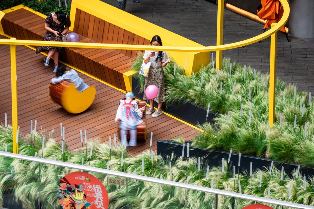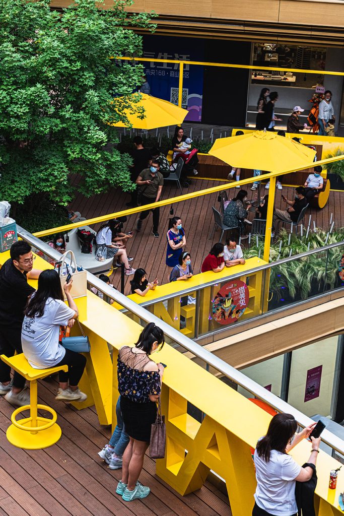 In terms of color, we boldly chose bright yellow, which was utterly different from the building. It makes the landscape facilities more prominent and enhances their “prefabricated” appearance. At the same time, the bright yellow also makes each small space more light, warm, and pleasant, forming an escape from the cold architectural atmosphere.